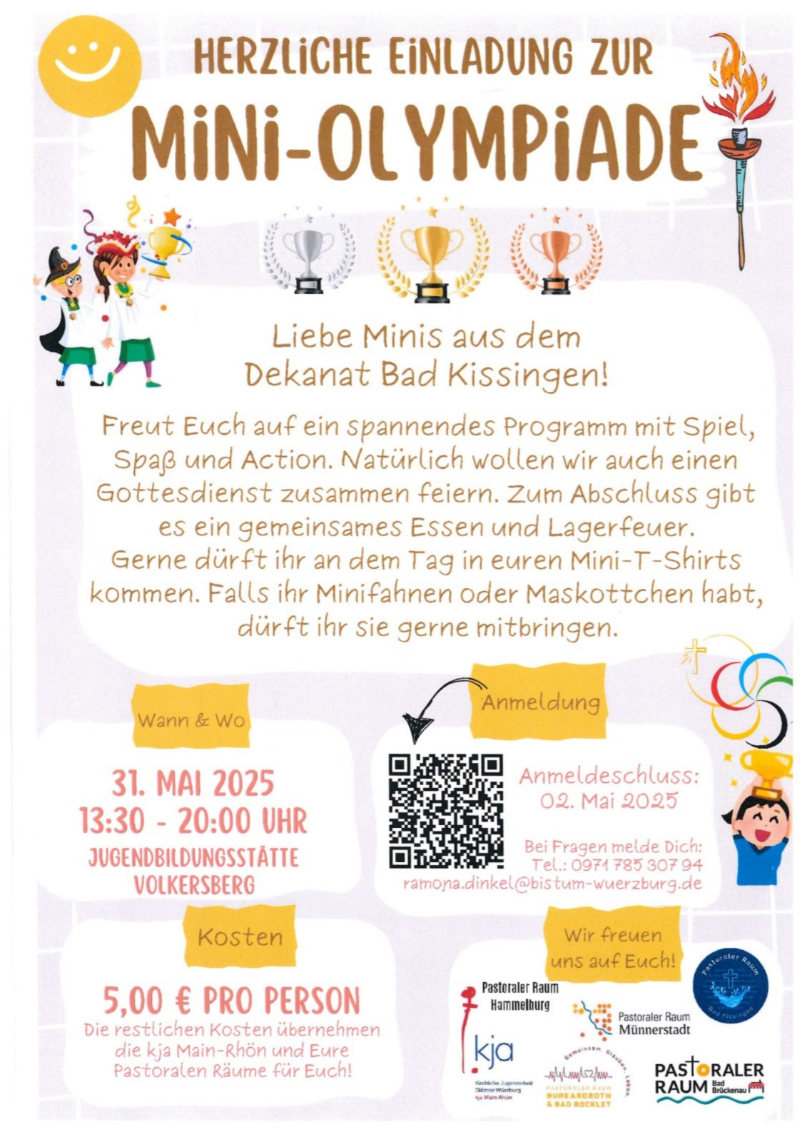 Freut Euch auf ein spannendes Programm mit Spiel,Spaß und Action. Natürlich wollen wir auch einenGottesdienst zusammen feiern. Zum Abschluss gibtes ein gemeinsames Essen und Lagerfeuer.Gerne dürft ihr an dem Tag in euren Mini-T-Shirtskommen. Falls ihr Minifahnen oder Maskottchen habt,dürft ihr sie gerne mitbringen.