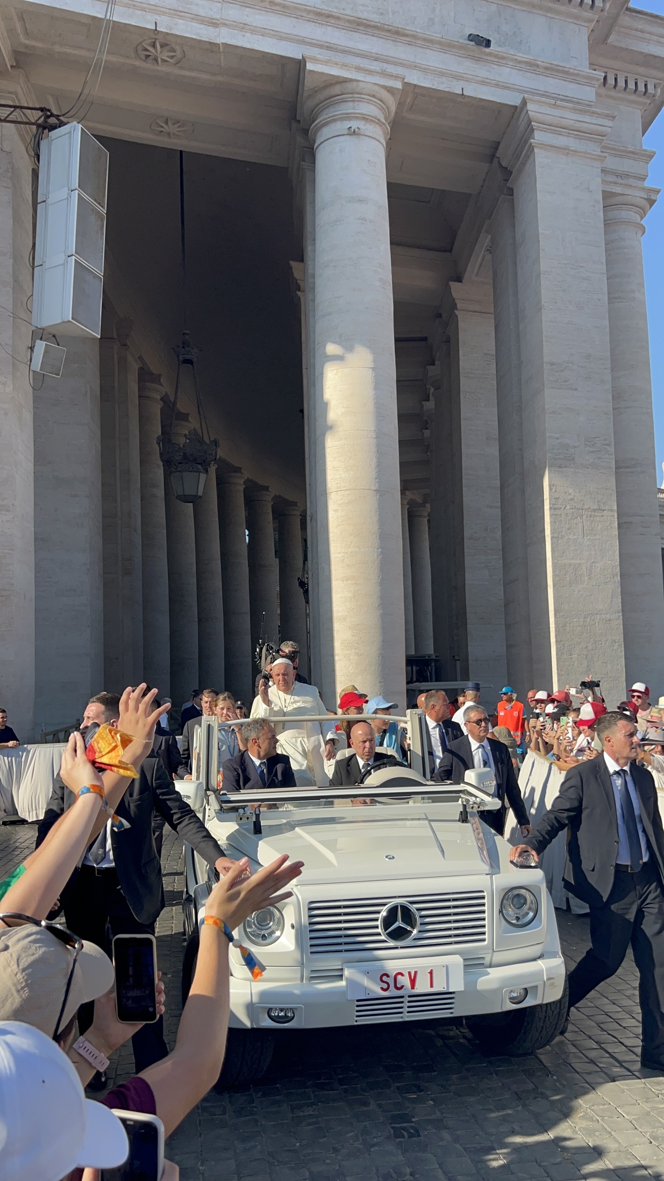 Wir fuhren in unserer Kleingruppe mit der Metro in Richtung Petersplatz, wo wir über einen Seiteneingang auf den Petersplatz kamen. Nach der Sicherheitskontrolle gingen wir zielgerichtet zum vordersten Block und sicherten uns Plätze direkt an der Absperrung, dort wo Papst Franziskus später vorbei fahren würde. Und nun hieß es erstmal gut 3 Stunden bei fast 39 Grad in der Sonne warten. Das Vorprogramm sorgte für eine kurzweilige Zeit. Und dann war es endlich soweit. Papst Franziskus kam direkt an uns in einer Entfernung von einem Meter an uns vorbei gefahren, und das sogar zwei Mal. Gänsehautpur und ein Erlebnis, dass man die vergessen wird. Nun feierten wir eine Andacht in der der Papst betonte, dass eine wir jungen Menschen der Kirche gut tun, mit unserem Dienst den wir am Altar verrichten.
