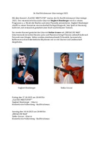 Mit dem Konzert „CLASSIC MEETS POP“ starten die 36. Bad Brückenauer Gitarrentage 2025. Der renommierte klassische Gitarrist Siegbert Remberger wird in seinem Programm u. a. Musik der Beatles und Astor Piazzolla präsentieren. Siegbert Remberger schafft in seinen Konzerten eine zauberhaft farbige Klangwelt. Sein Spiel ist feinsinnig kultiviert, mit erstaunlich gestalterischer Kraft und brillanter Technik.